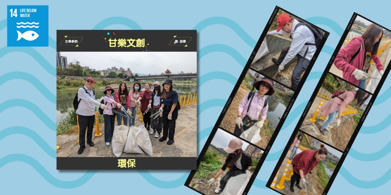 【SDGs11】透過工作人員導覽,參觀了百年醫院改建的職人豆製所 (禾乃川國產豆製所),喝到了全台灣最濃的豆漿,穿越時空般地逛著古色古香的三峽老街,還發現超過250年歷史的三峽清水祖師廟裡竟然有邱比特石雕! 《甘樂文創》創辦人 – 林峻丞(峻哥)不只帶我們認識三峽的美,也讓我們更瞭解在地文化的傳承與教育對社會的影響之大。這次的講座,我們深刻了解到,原來在台灣這塊土地上,許多我們看不見的角落,有群孩子是處於急需幫助的家庭環境,夾縫中求成長。 【SDGs14】全員來了一場超熱血的淨溪初體驗!陡斜的坡,大家手勾手照樣下去撿,用生命在淨溪!短時間就集滿了2大袋垃圾,讓我們真實地體會到愛護環境這件事刻不容緩!接著帶上自備的舊衣衫,體驗了 913舊衣衫循環共享提袋 超有趣的手作環保袋課程。