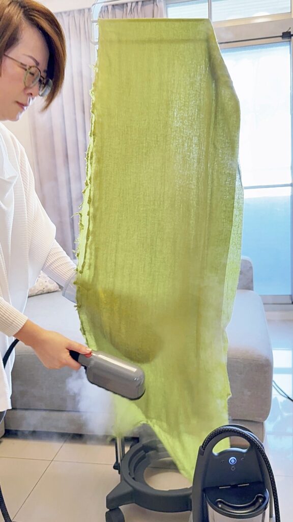 👉蒸氣來回掃一遍,味道揮發、皺褶展開,布料恢復原有柔軟,不傷纖維、回復彈性
