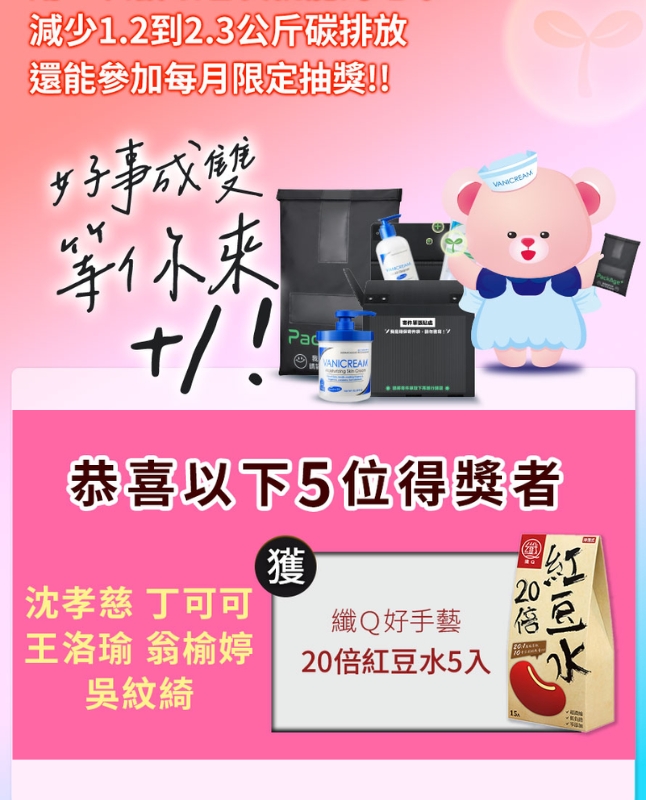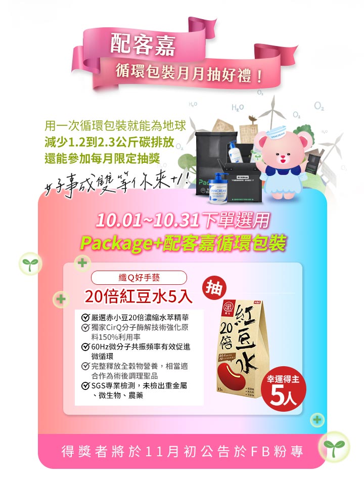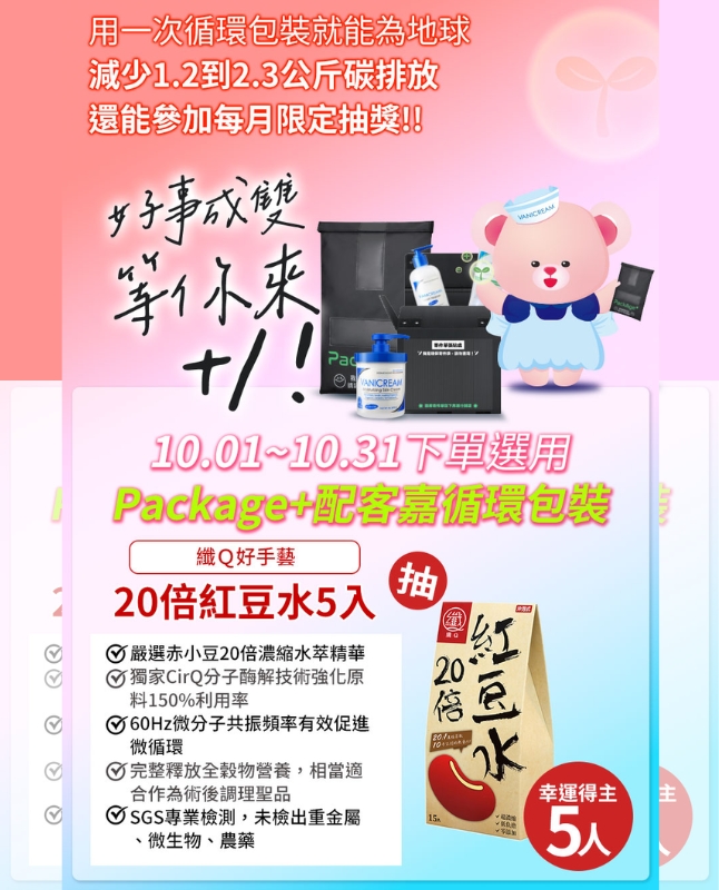於薇霓肌本官方電商平台消費,結帳時選用「PackAge+配客嘉」,抽易珈生技《纖Q紅豆水》5名