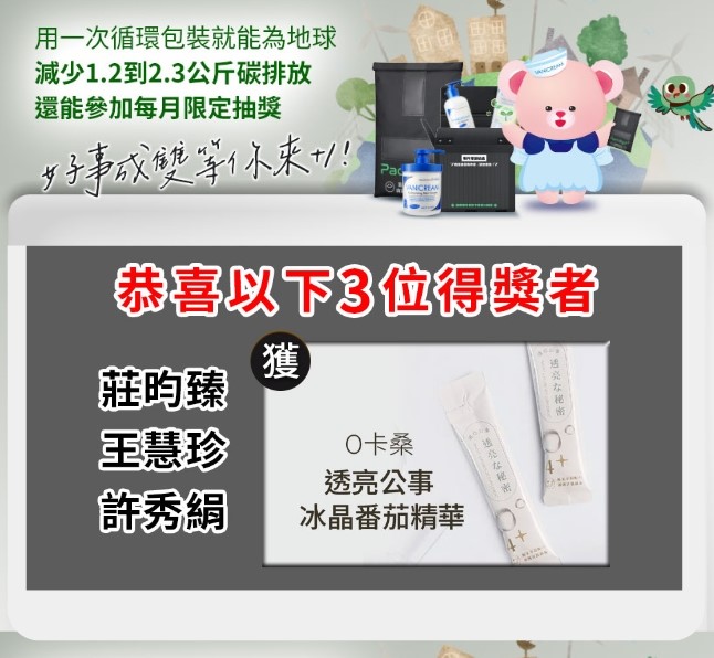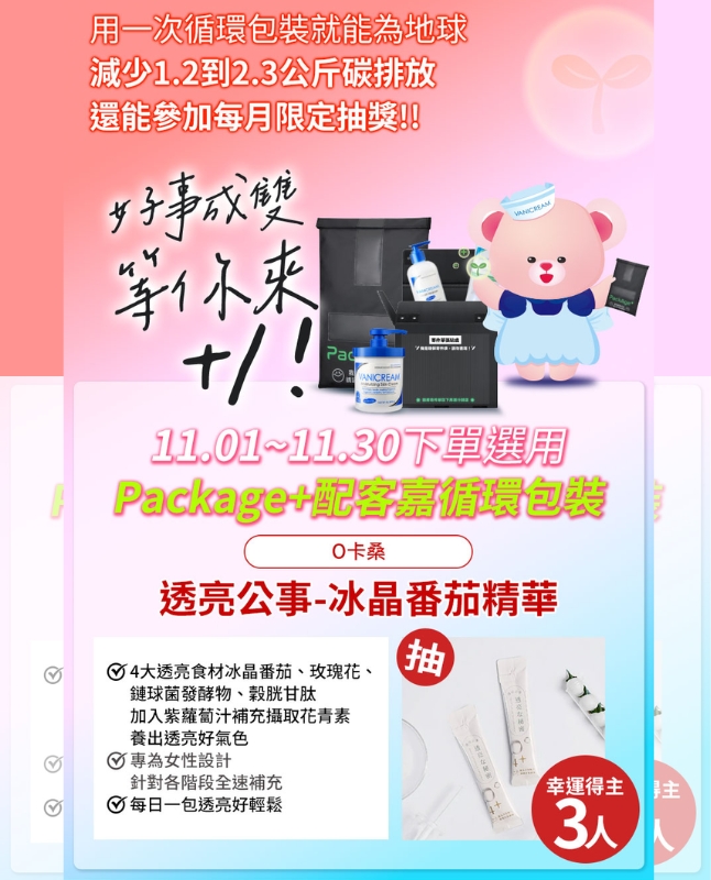 於薇霓肌本官方電商平台消費,結帳時選用「PackAge+配客嘉」,抽O卡桑